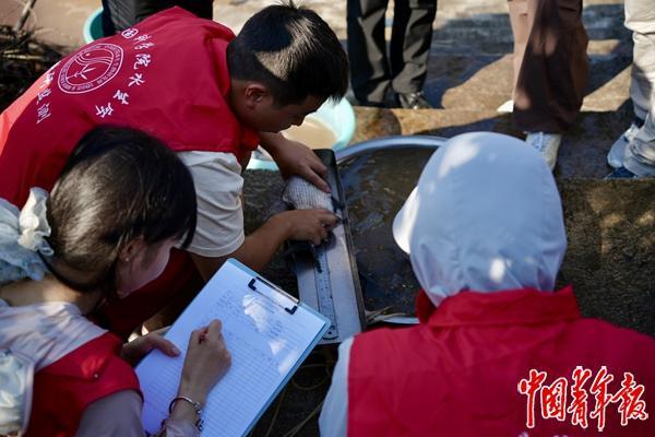 “495,413。”一名科研人员穿着印有水生所标识的红背心,对刚捕获的鱼类样本进行测量,并报出这串数字,另一名科研人员拿着笔迅速记录。