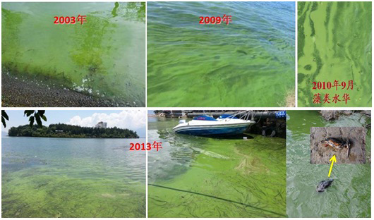 图3 云南洱海蓝藻水华的演变趋势,水华发生日益频繁。2013年夏季,水华最盛时覆盖了近80%的湖面,令人吃惊的是,从一只死在岸边水华中的野鸟(下排最右边的图片)体内还检测出了微囊藻毒素