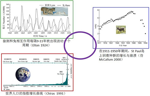 包括水在内的许多环境问题还有更深、更复杂的渊源。技术的盲目崇拜者认为技术可以解决一切,这实际上是在妄想人可以超越自然界,但这是不可能的,因此,那些所谓的可持续发展(增长)观念也只是一种蛊惑人心的口号,因为地球在空间上是有限的,它的承载能力亦如此。在人类尚未统治自然界之前,数以千万计的物种共存在这个地球表面,在一定的气候背景和生存条件下,一个物种大致会保持一种震荡的平衡趋势,一个典型的例子就是猞猁和兔子,它们每隔10年左右出现一个波动周期(图17,左上图),但是,人类凭借自己的智慧和技术,开始掌控自然界,将自然界中每一寸可用的土地据为己有,打破了自身的平衡波动模式,导致了人口的狂飙(图17,左下图)。