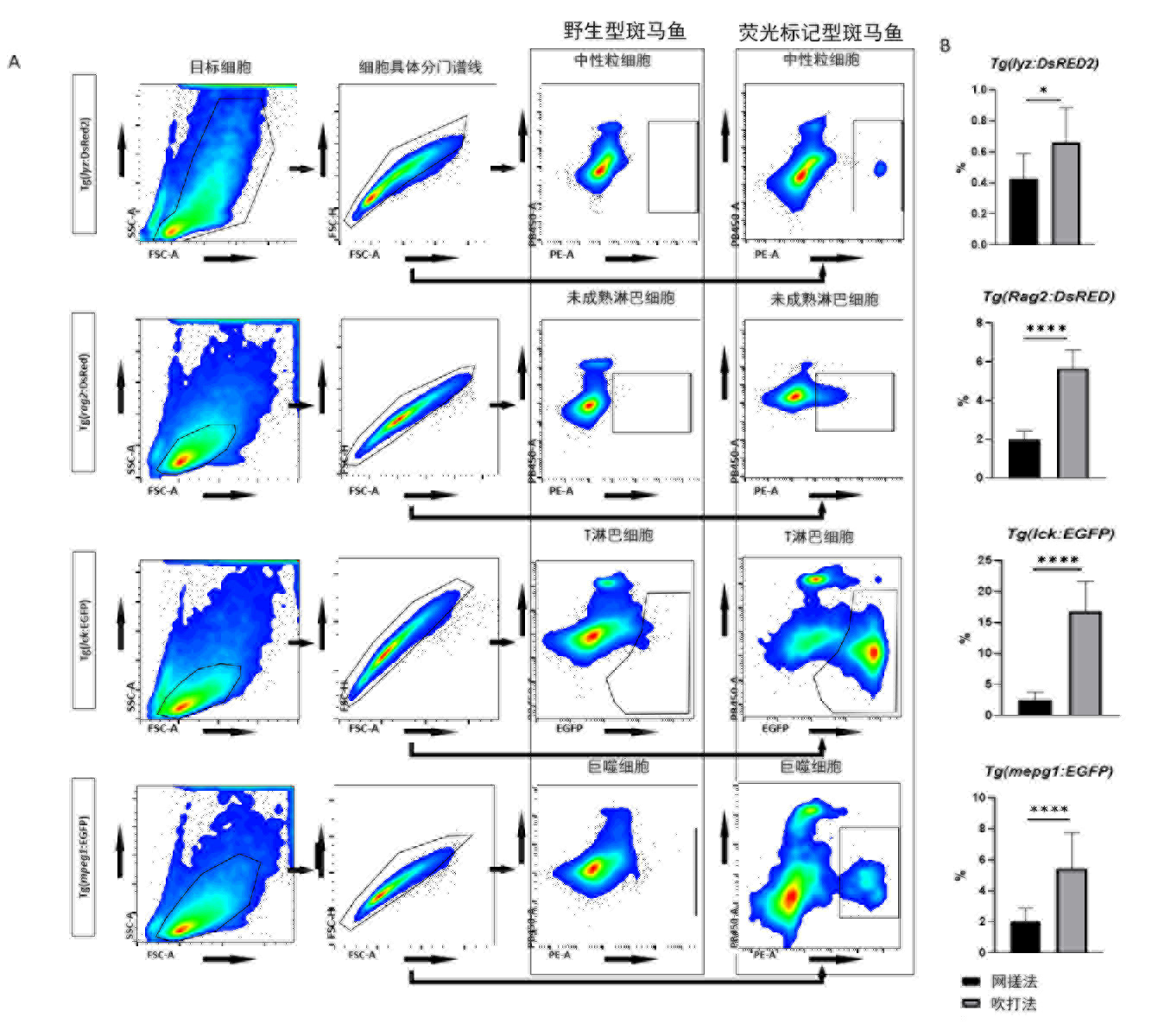 进一步,对目前的吹打法制备的细胞悬液及其流式细胞术进行了应用。在对各类型的免疫细胞(荧光标记)进行了流式细胞术分析,与网搓法比,吹打法能显著提高肠黏膜来源的细胞悬液中免疫细胞的得率;而对其他免疫组织(外周血、头肾、脾脏、肝脏)来源的细胞悬液的对比分析,发现肠免疫细胞比例符合鱼类免疫细胞的正常分布比例。通过吹打法在斑马鱼SBMIE肠炎模型中的应用分析,表明该方法能够准确反映肠炎相关免疫细胞比例变化(图3)。