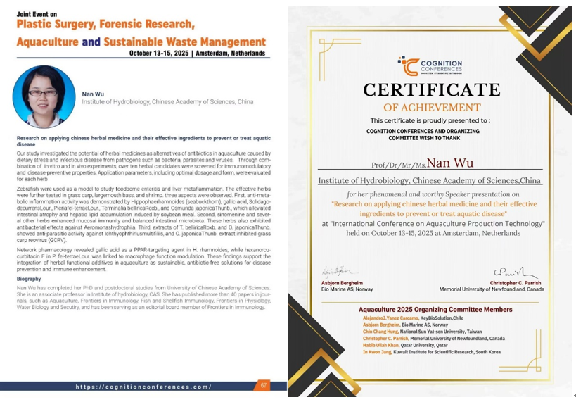 中国科学院水生生物研究所鱼类功能基因组学研究组吴南副研究员递交了有关“Research on Applying Chinese Herbal Medicine and Their Effective Ingredients to Prevent or Treat Aquatic Disease”的摘要,并15日阿姆斯特丹时间9点,在线参加了“Joint Event on Plastic Surgery,Forensic Research,Aquaculture and Sustainable Waste Management”的专题论坛。