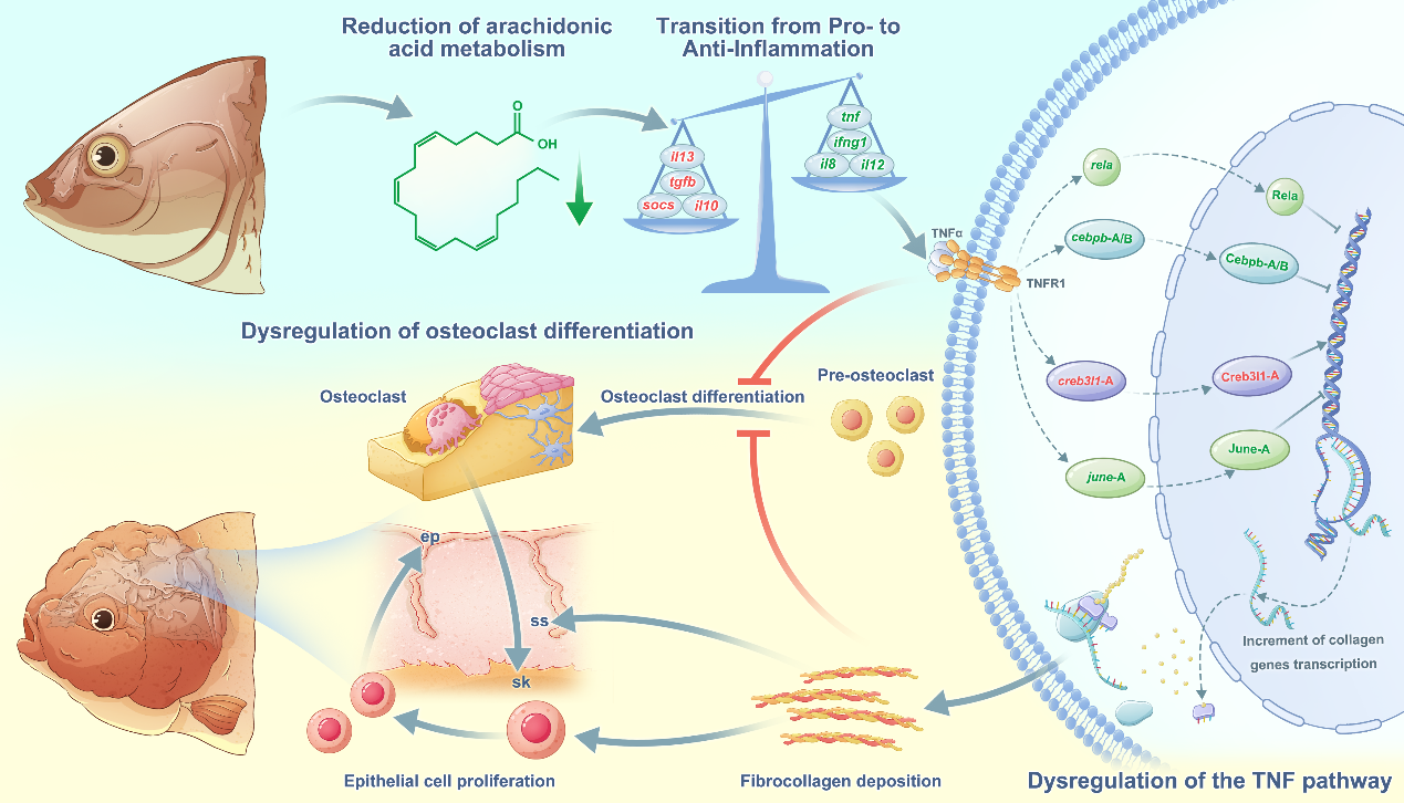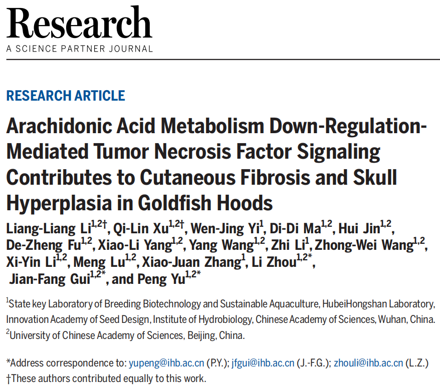 近期,中国科学院水生生物研究所桂建芳院士团队在Research上发表了题为“Arachidonic acid metabolism downregulation-mediated TNF signaling contributes to cutaneous fibrosis and skull hyperplasia in goldfish hoods”的研究论文,团队发现,狮头金鱼的头瘤本质上是一种皮肤纤维化结构,富含纤维型胶原蛋白;进一步研究揭示,花生四烯酸代谢的下调通过引起TNF信号通路的异常表达,促进胶原蛋白异常沉积与颅骨结构改变,从而驱动头瘤的形态发生。该研究不仅首次系统解析了金鱼头瘤形成的细胞与分子机制,为观赏鱼性状选育提供了理论依据,也为人类纤维化疾病的研究提供了新的视角。