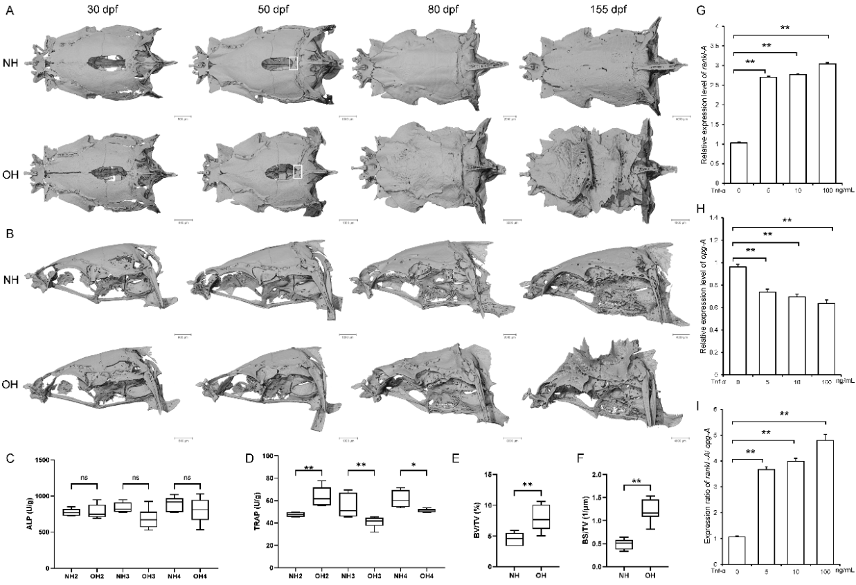 研究团队发现,狮头金鱼头瘤形态发生过程中还伴随颅骨不规则增生与异常骨性凸起。实验结果证实了TNF与破骨细胞分化之间的调控关系,揭示了狮头金鱼头骨形态改变的潜在分子机制以及利于头瘤后期附着的结构性基础(图2)。