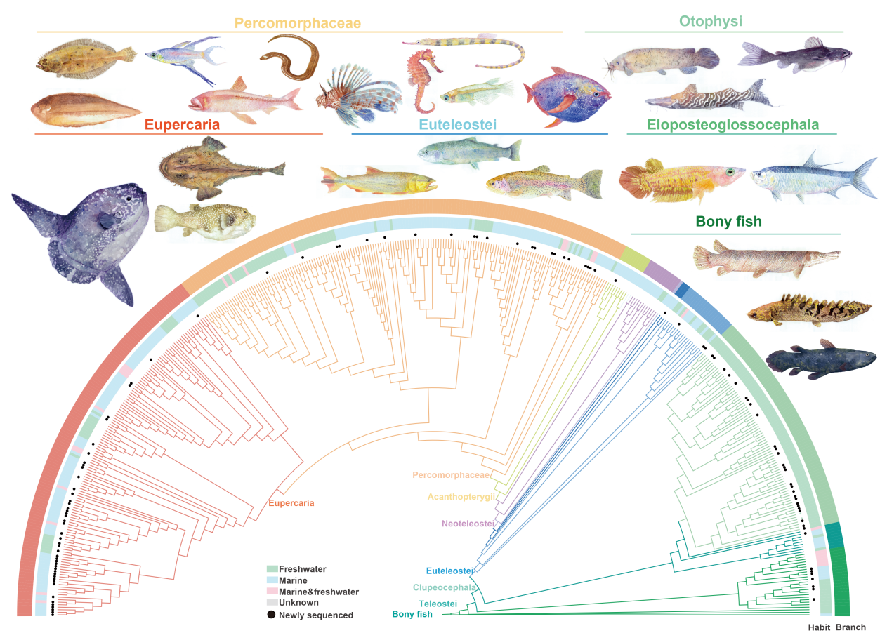 鱼类是地球上数量最多、形态最丰富的脊椎动物类群,约占现生脊椎动物物种总数的一半,约30,000余种。它们广泛分布于从深海到高原湖泊的各类水域,展现出卓越的生态适应能力和惊人的演化多样性。尽管在过去二十年中鱼类基因组学取得了显著进展,但不同类群间的基因组数据仍不均衡,缺乏覆盖全部真骨鱼目的系统性比较资源。这一缺口严重制约了人们从基因组层面系统揭示鱼类演化规律及关键性状形成机制的深入研究。