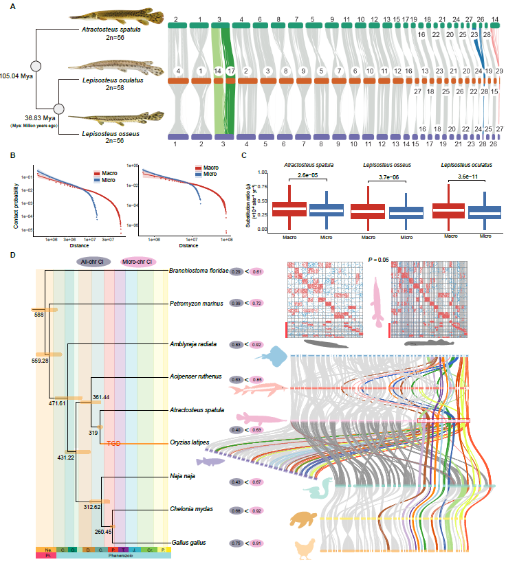 在前期工作的基础上,中国科学院水生生物研究所何舜平院士团队进一步与耶鲁大学Thomas J. Near教授团队合作,深入研究了雀鳝目鱼类形态变化缓慢的基因组学机制。研究团队首先获得鳄雀鳝属的鳄雀鳝与雀鳝属的长吻雀鳝的染色体级基因组。研究发现了两个属鱼类在染色体结构上存在融合事件,并揭示了惊人的保守性:两个属鱼类在分化超过1亿年后,依然有83.35%的基因组完全一致;基因组大小差异几乎全部源于单碱基的插入/缺失,而非大规模结构变化;微染色体结构比大染色体更加稳定,且显著富集于DNA修复与细胞凋亡相关基因;演化速率极度缓慢,染色体重排率仅约 0.5 次/百万年;与四足动物的基因组相似度甚至高于近缘的真骨鱼类;转座元件的产生率与活跃度在脊椎动物中最低,推测其低活性是维持基因组稳定性的重要原因。令人惊讶的是,白垩纪分化的两个属在现生环境中依然可以跨属杂交并产生可存活后代。群体基因组分析显示,两个属虽存在明显的谱系分化,历史上仍有有限的基因流事件,这种持续的杂交能力或源于它们长期的基因组结构保守与低分子不相容性。