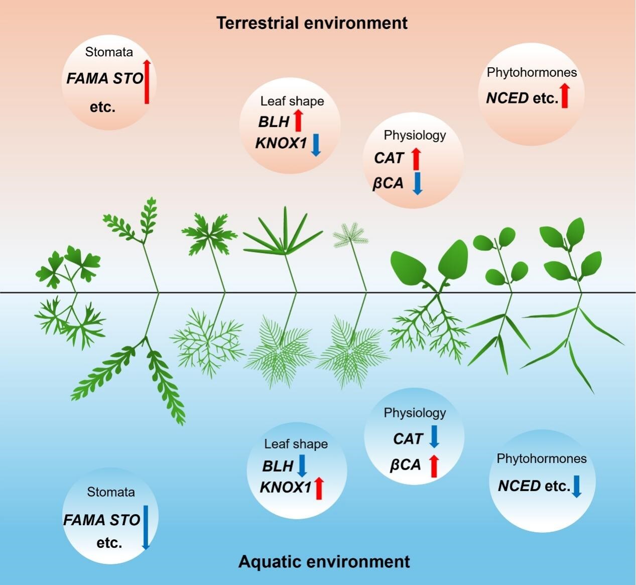 水生植物为应对水位升降而演化出了异形叶来适应环境。异形叶植物的陆生叶形简单,气孔密度较高,而水生叶则趋同演化出了相似表型:叶形多为深裂或线形,表皮气孔密度降低或缺失。近年来,国内外开展了一些水生植物异形叶的调控机制研究,但个别物种的调控途径不足以代表各类水生植物异形叶趋同演化的普遍规律,其特殊性和普遍性仍存在争议。