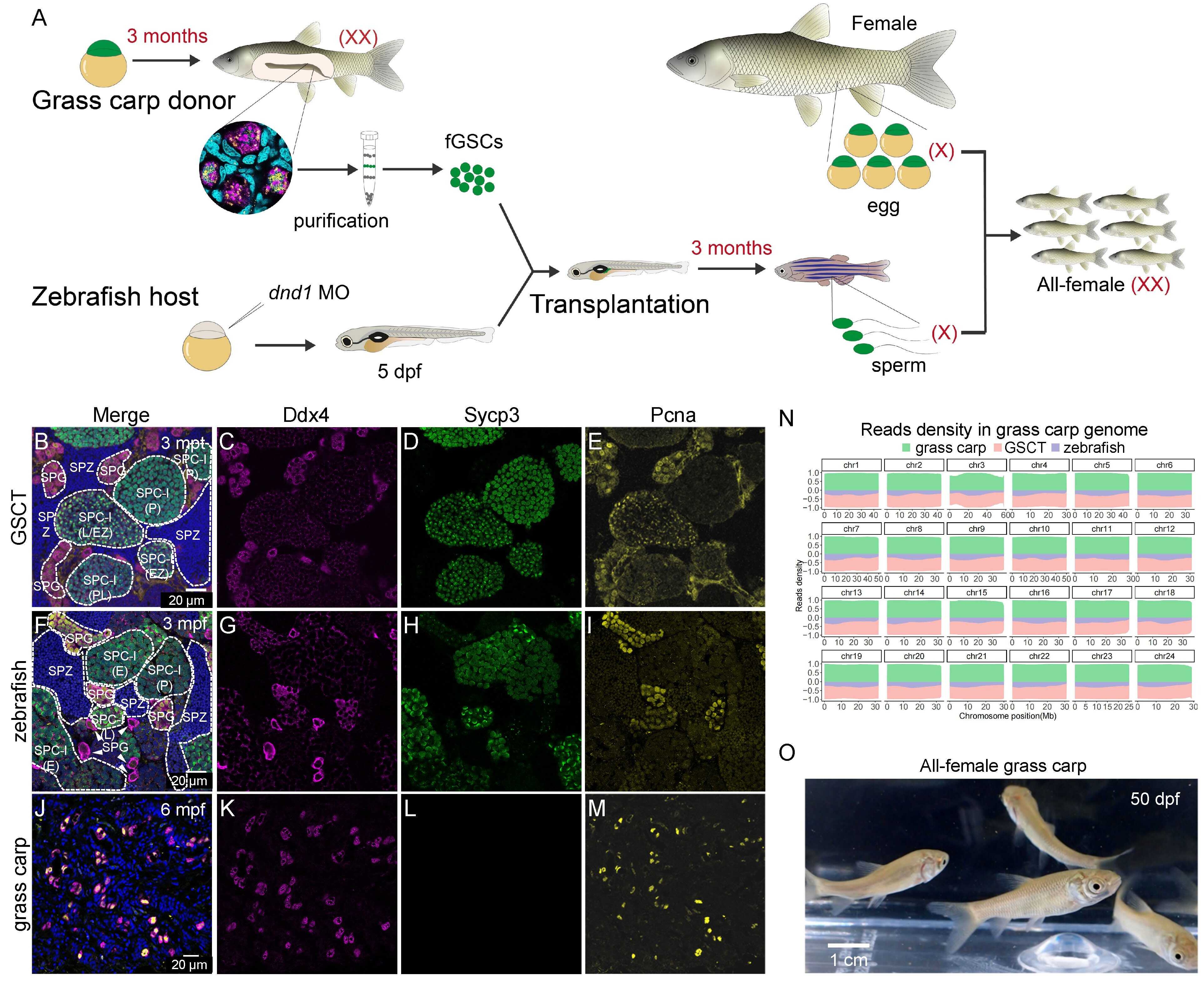 他们进一步分离3月龄的草鱼卵巢,纯化获得雌性生殖干细胞,移植入内源生殖细胞剔除的斑马鱼幼苗生殖嵴。在移植形成的重组性腺中,草鱼生殖细胞在斑马鱼性腺微环境中快速启动精子发生进程,仅需3个月即分化为成熟精子。重要的是,所有的精子均为全X基因型,与普通草鱼卵受精即获得全雌草鱼子代,从而实现全雌草鱼新品系的超速培育(图3)。
