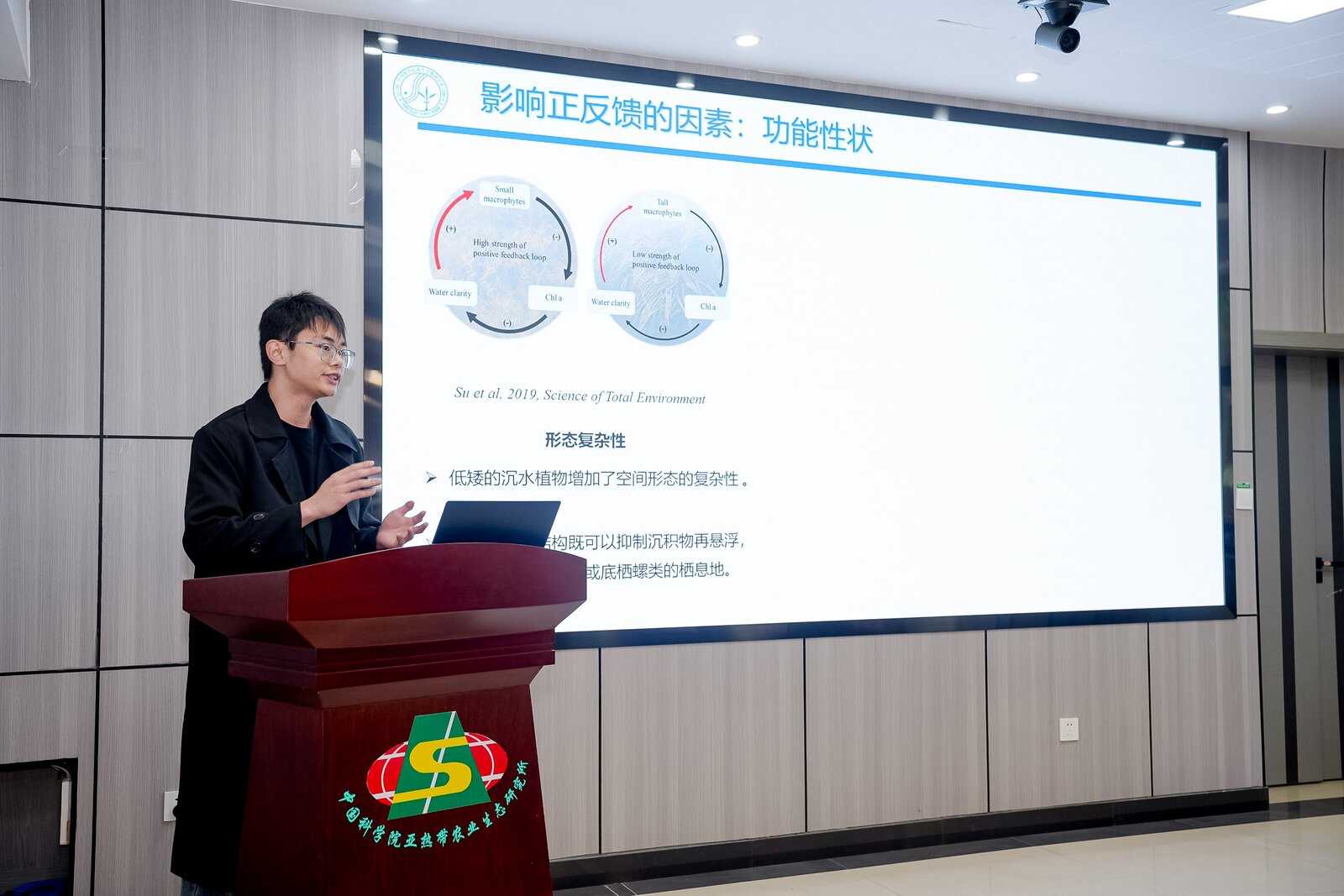 报告中,程超跃同学系统介绍了沉水植物在维持浅水湖泊清水稳态中的关键作用,全面梳理了国内外关于“草型清水—藻型浊水”稳态转换的研究进展,并就富营养化驱动下正反馈机制弱化、生态弹性降低等科学问题进行了重点阐述。对长江中下游及云贵高原的野外调查,并进行中宇宙实验,揭示了功能性状和物种多样性在维持浅水湖泊清水状态下生态弹性的重要性以及富营养化降低清水状态下生态系统弹性的路径。