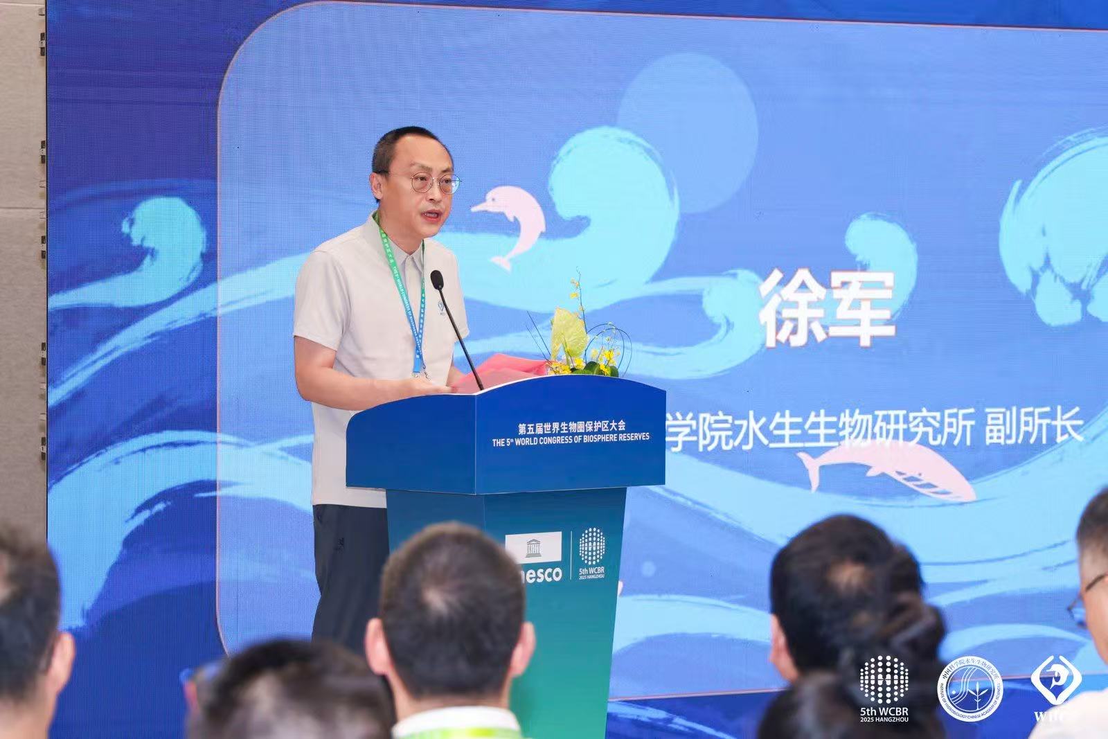 第五届世界生物圈保护区大会执委会常务副主任、水生所研究员、武汉白鱀豚保护基金会理事长王丁致辞