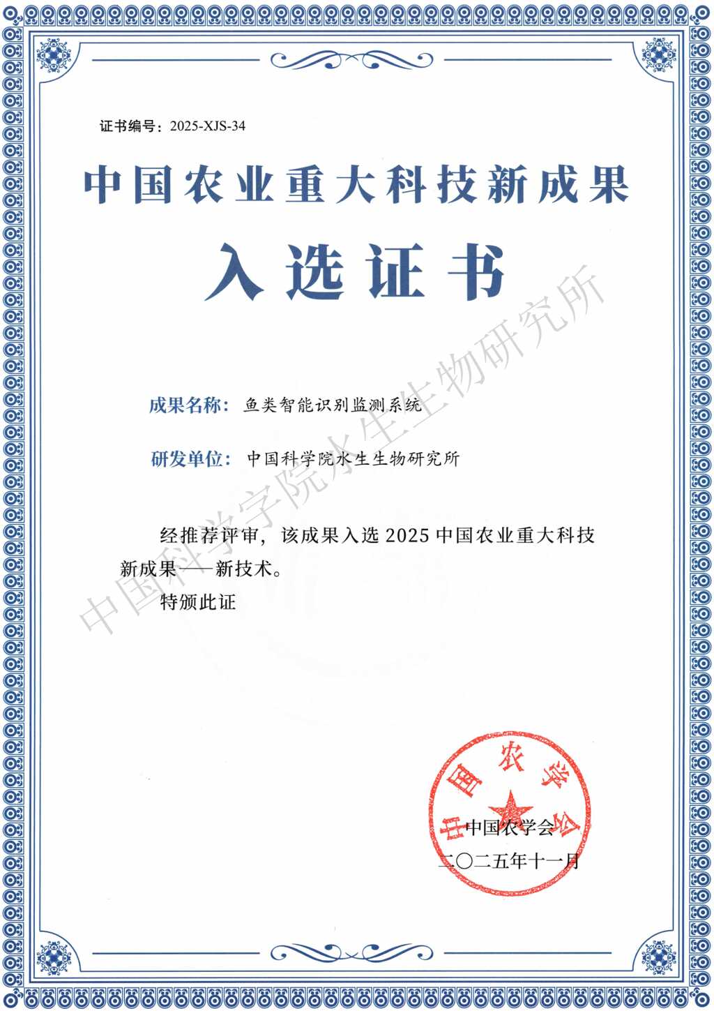 近日,中国科学院水生生物研究所渔业智能技术与装备研究团队科技成果“鱼类智能识别监测系统”入选2025中国农业重大科技新成果,相关产品亮相2025湖北省农业博览会。