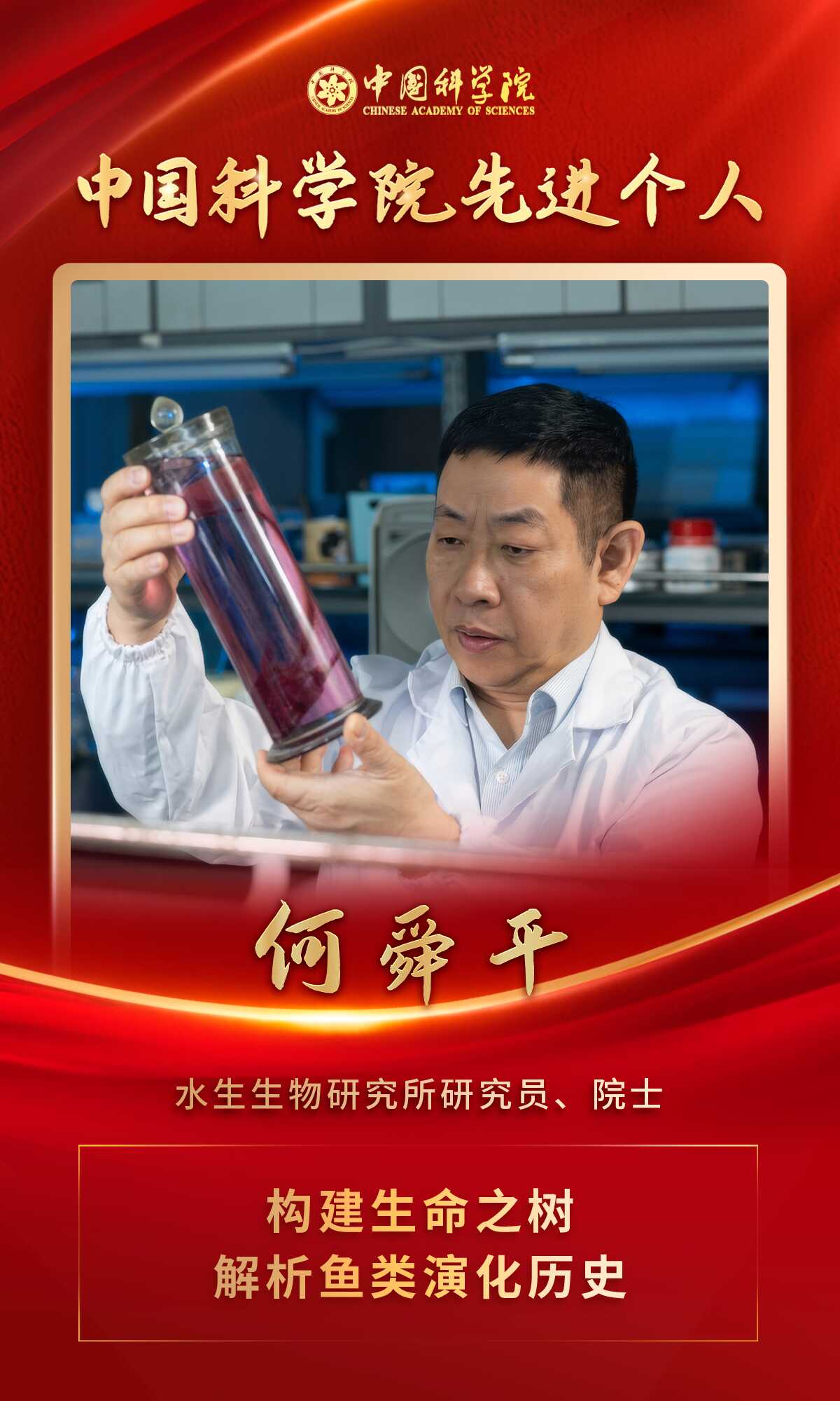 何舜平同志把国家重大需求放在科研首位,积极投身长江大保护和向海图强战略,牵头万种鱼基因组计划(Fish10K),绘制全球首个覆盖目级鱼类百科全书图谱;潜心研究40余年,成功揭示脊椎动物从水生到陆生的遗传密码;带领团队8次下潜马里亚纳海沟采集深渊鱼类样品,推动了我国深海和深渊鱼类研究从无到有;构建长江鱼类DNA条形码和eDNA智能监测体系,为保障种业安全、发展蓝色经济提供了战略科技支撑。