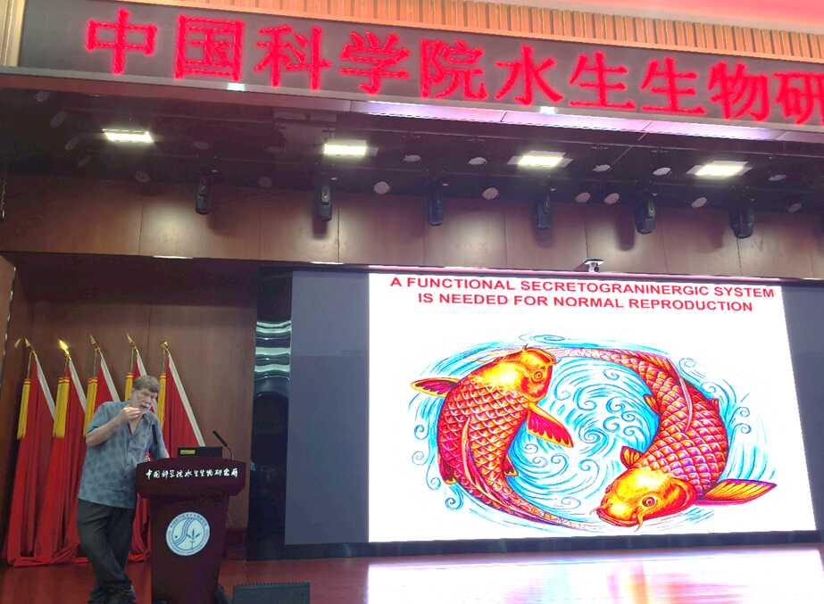 鱼类生殖受20余种神经内分泌因子的复杂调控,包括多种神经肽和神经递质。近年来,Vance L. Trudeau教授和水生所胡炜研究员团队合作,以鱼为研究对象发现了脊椎动物一种新的生殖内分泌激素Secretoneurin(SN),Vance L. Trudeau教授重点介绍了SN在鱼类生殖发育中的相关进展,包括合作利用scg2突变斑马鱼作为研究模型,首次揭示了SN在鱼类求偶行为中的重要作用,发现SN通过外泌体运输并直接作用于GnRH神经元,促进其增殖和激活,Vance L. Trudeau教授团队近期建立了scg2全基因序列敲除斑马鱼,进一步揭示scg2在生殖调控中的功能和机制。